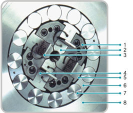 Æ®·¯½ºÆ®(4)¿Í ´ÙÀÌ(2) »çÀÌ¿¡´Â ½º¿þÀÌ¡ ´ÙÀÌÀÇ ³ôÀ̸¦ Á¶ÀýÇϱâ À§ÇÑ ½É(3)ÀÌ ÀÖ´Ù. ¼ÒÀ縦 °¡°øÇϱâ À§ÇØ °¡ÇØÁö´Â ÈûÀº Æ®·¯½ºÆ®(4)ÀÇ ¸Ó½¬·ë Çìµå(5)¿¡ ÀÇÇØ ºÎµå·´°Ô °¡ÇØÁø´Ù. ÇìµåÀÇ ¿øÈ°ÇÑ È¸ÀüÀ» À§ÇÏ¿© ·Ñ·¯ÄÉÀÌÁö(6)´Â ½º¿þÀÌ¡ Ãà(1)°ú ÁöÁö¸µ(8) »çÀÌ¿¡ À§Ä¡ÇÑ´Ù. ÇÏÁßÀ» °¡ÇÏ´Â ½Ç¸°´õÇü ·Ñ·¯(7)´Â Á¤¹Ð °¡°øµÈ ·Ñ·¯ÄÉÀÌÁö(6)ÀÇ °¢ ºÎºÐ¿¡ À§Ä¡ÇÑ´Ù.